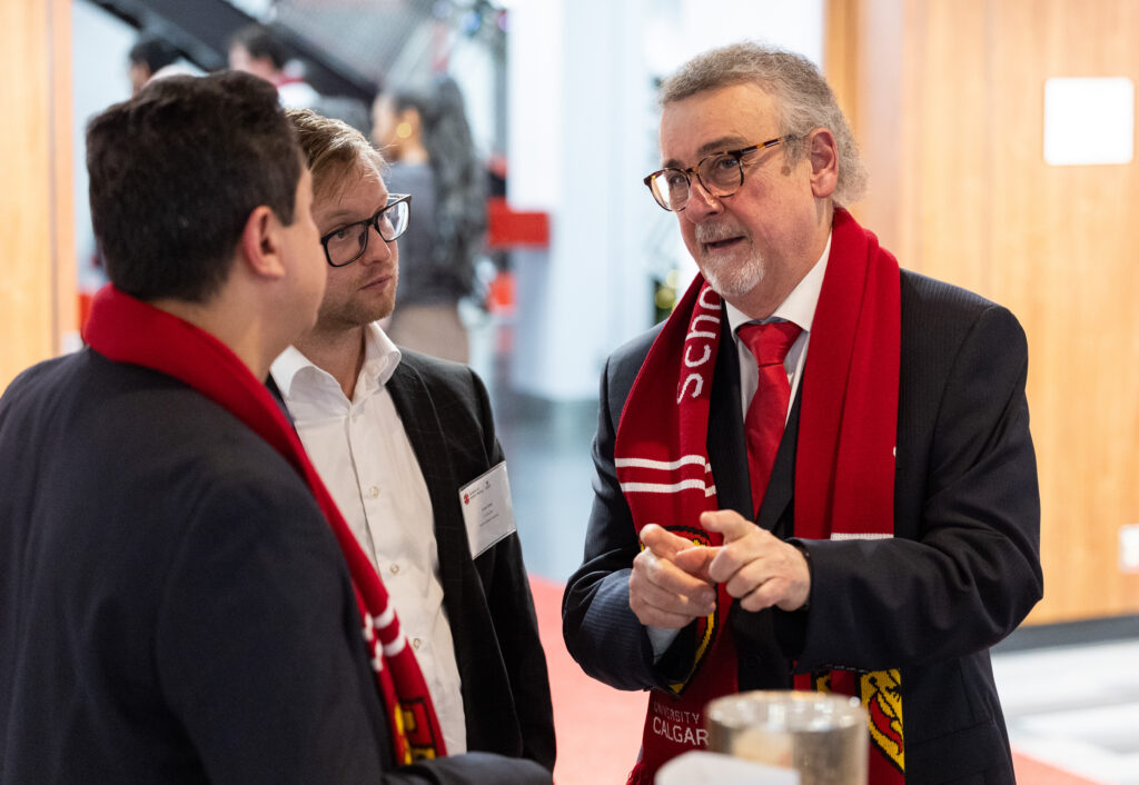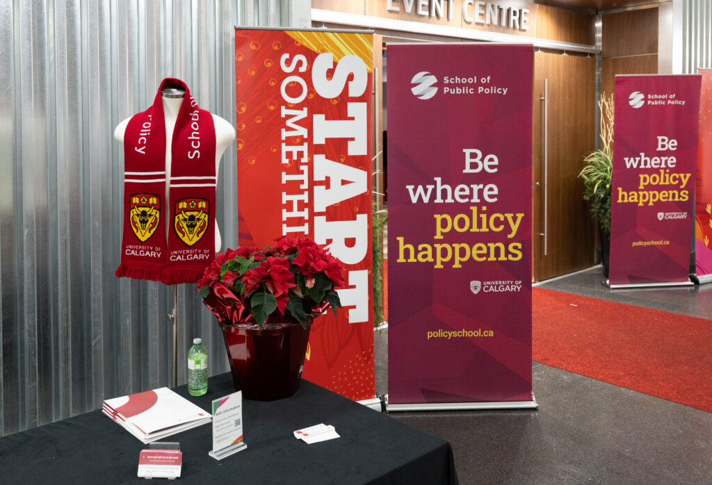 More than 300 people attended the open house as the main floor of the Downtown Campus was transformed into a networking and conversation space that highlighted University of Calgary and School of Public Policy colors and branding.